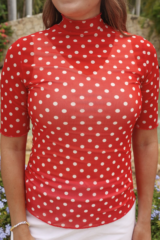 PREORDER- Kora Short Sleeve Mesh Top- Red Polka Dot