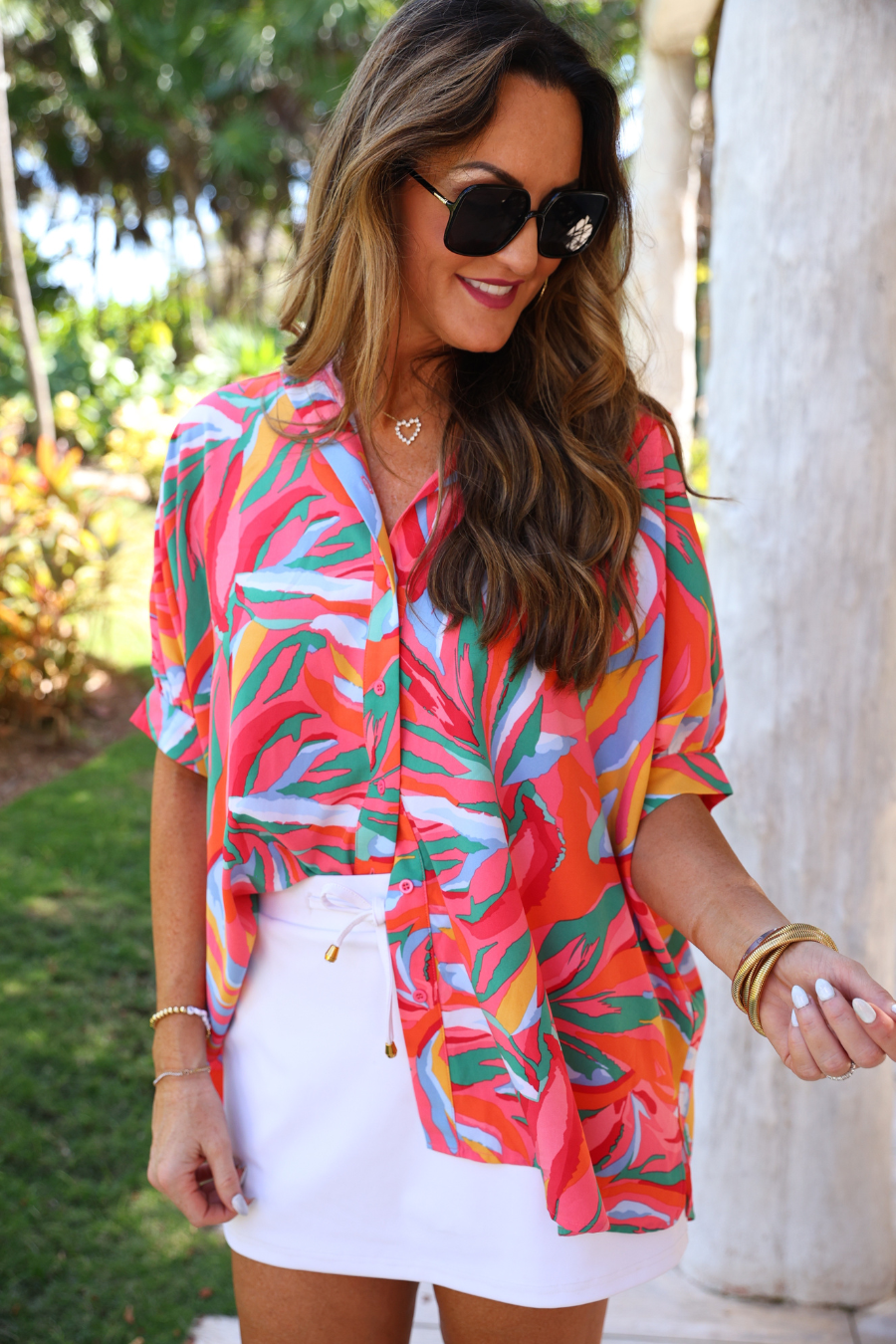 Looking for a fun and colorful top that will make a statement? Look no further than our Clementine Oversized Top. With its bold abstract pattern, button up design, and comfortable oversized fit, this top is perfect for those who want to stand out in style. Don't miss out on this must-have piece!