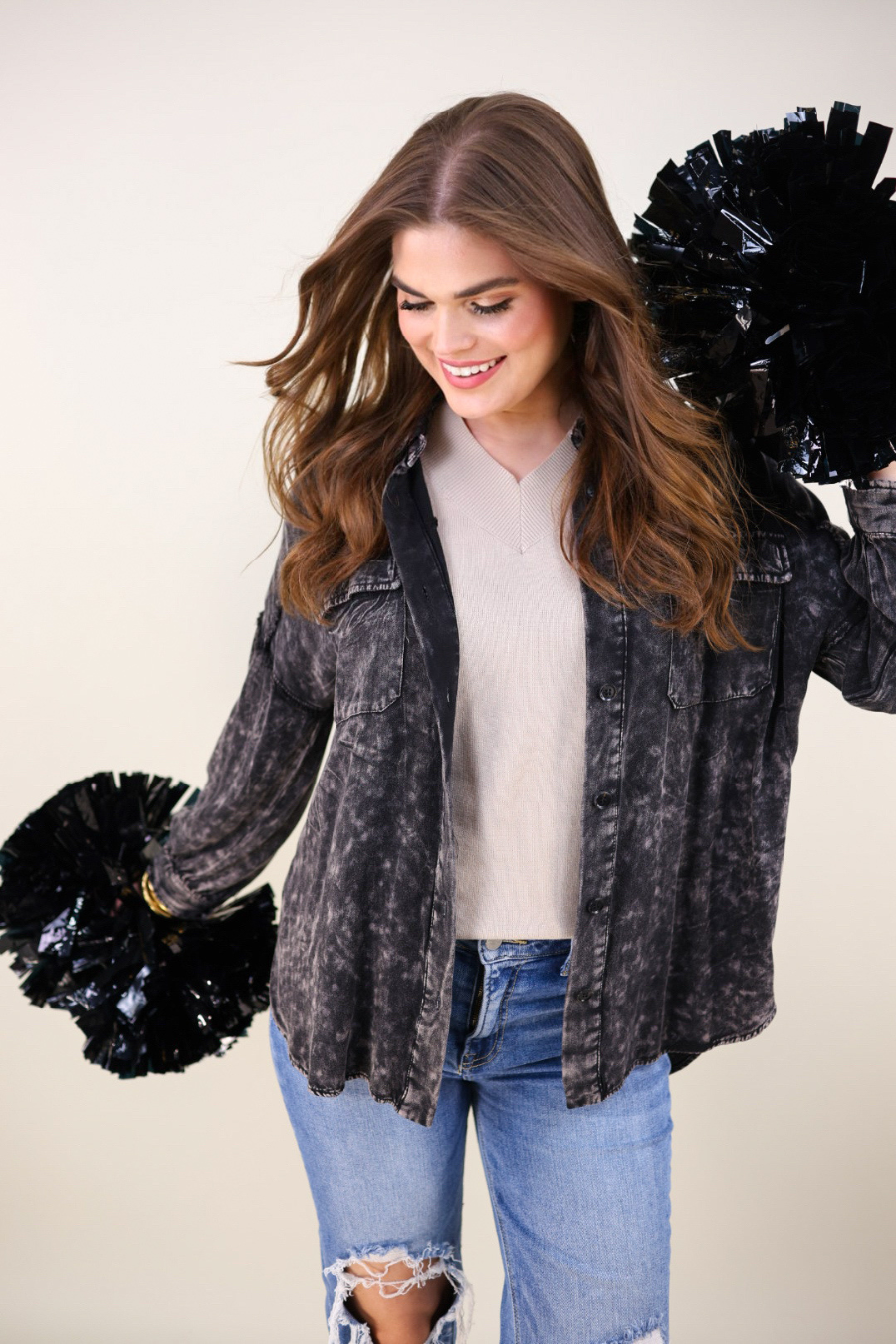 Stay casual but chic in our fashionable acid washed colored top featuring soft lightweight material, a button up front with a collared neckline, long loose sleeves with button closure cuffs, two oversized accent chest pockets, and a slouched silhouette that falls into a rounded hemline!