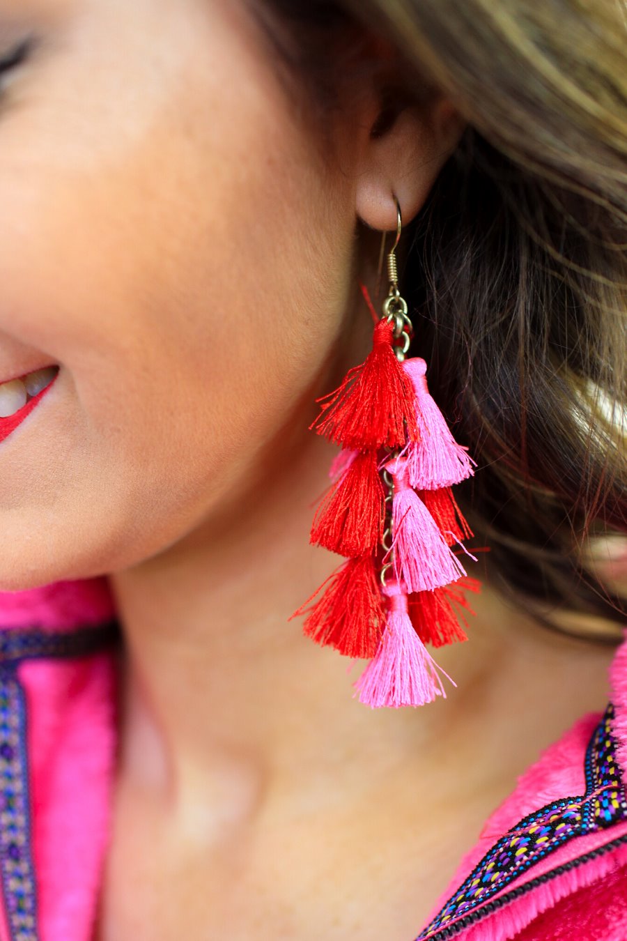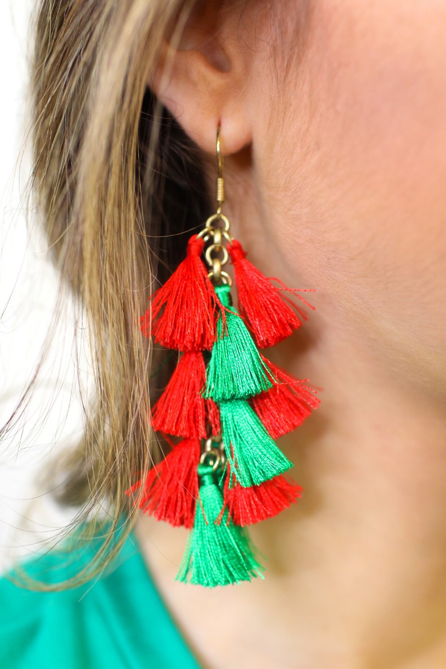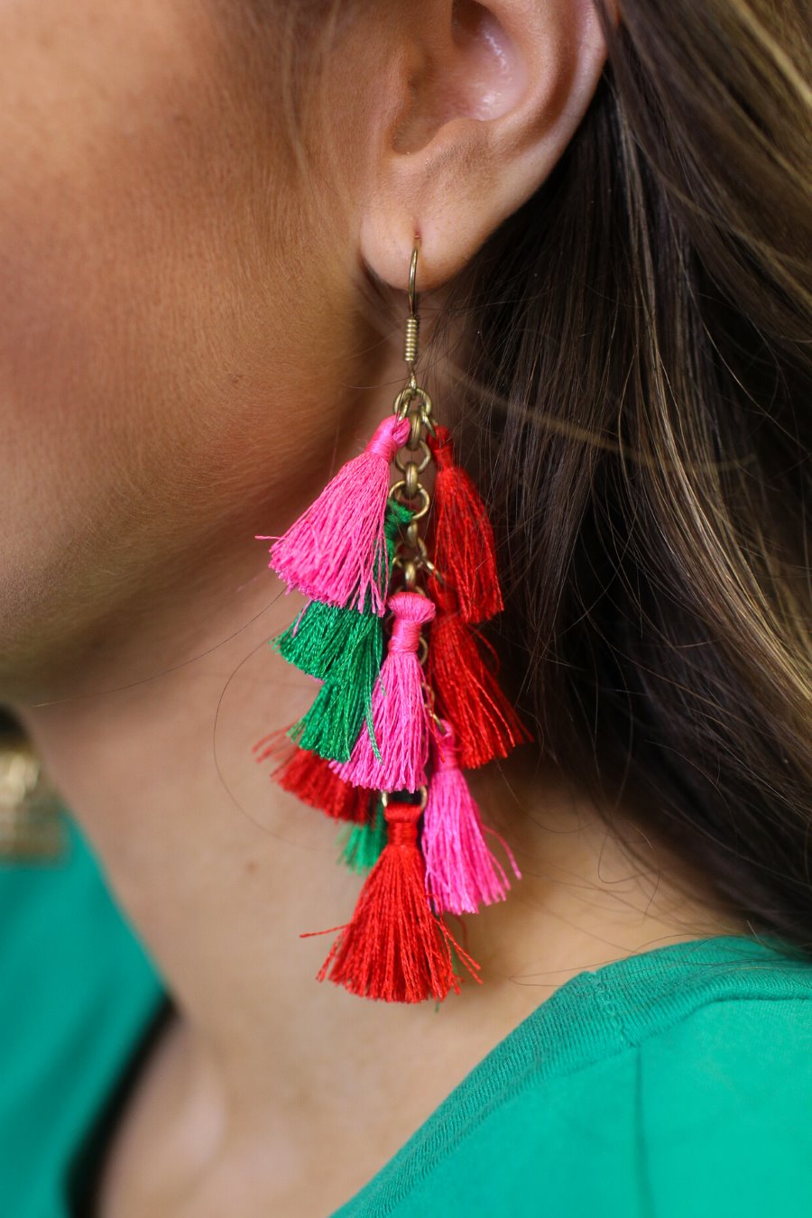 We are absolutely obsessed with these fringe tassel earrings! They feature colorful layered tassels and a hook. Throw these one with any outfit and make it festive and fun!