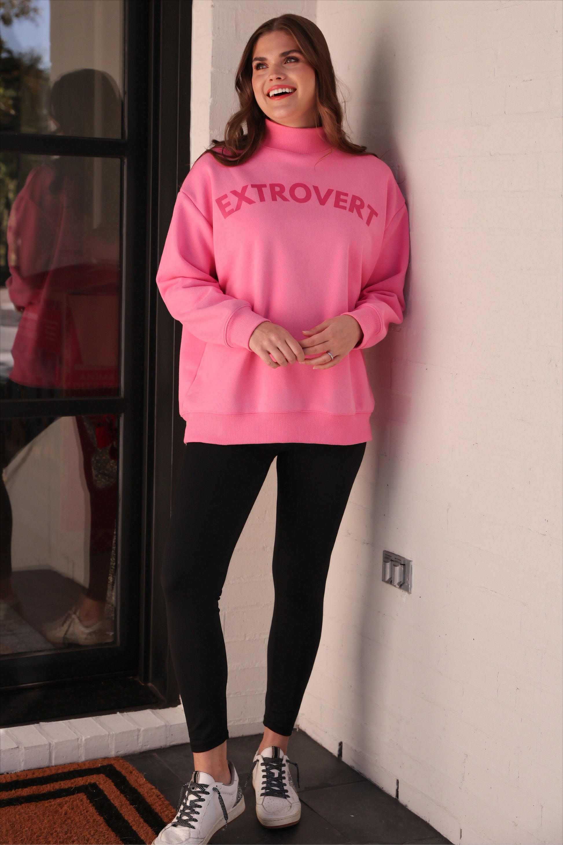 Cozy up in style with our Extrovert Mock Neck Pullover. Featuring a soft fleece lining and trendy oversized fit, this playful piece flaunts a chic mock neck and boldly declares "Extrovert" right on the front. Perfect for making comfy cool statements!
