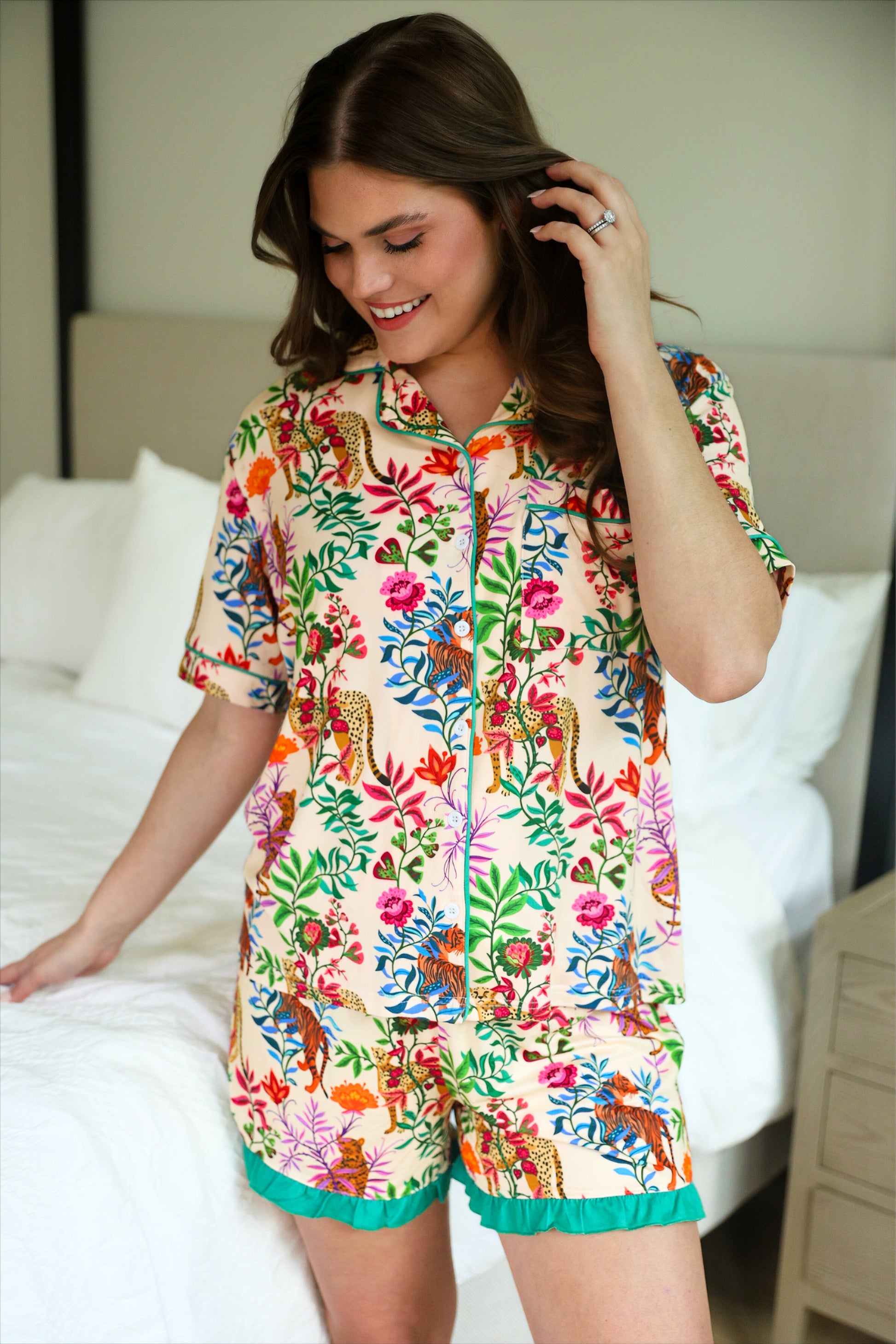 Lounge in style with our Jungle Oasis Ruffle Pajama Set. Featuring a bright and colorful print, button up top, and playful ruffle shorts with a decorative tie. Get ready for a comfortable and fun night's sleep!