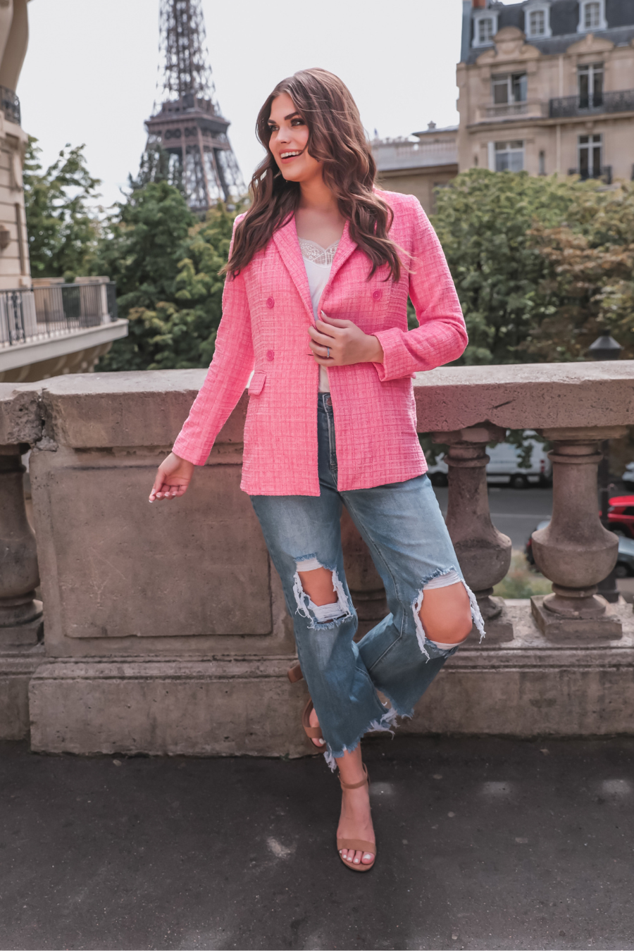 Up your work wardrobe with the Margot pink tweed blazer! This girl boss-worthy number is detailed with front buttons and functional pockets, making it both practical and stylish for those 9-5s. Look sharp and feel fabulous!