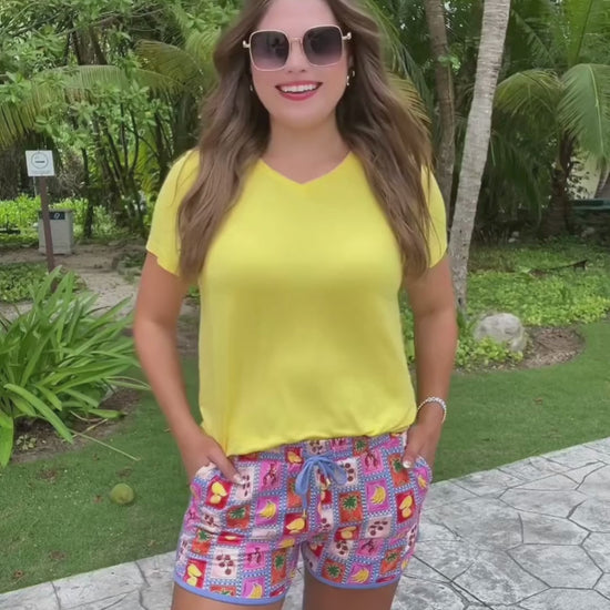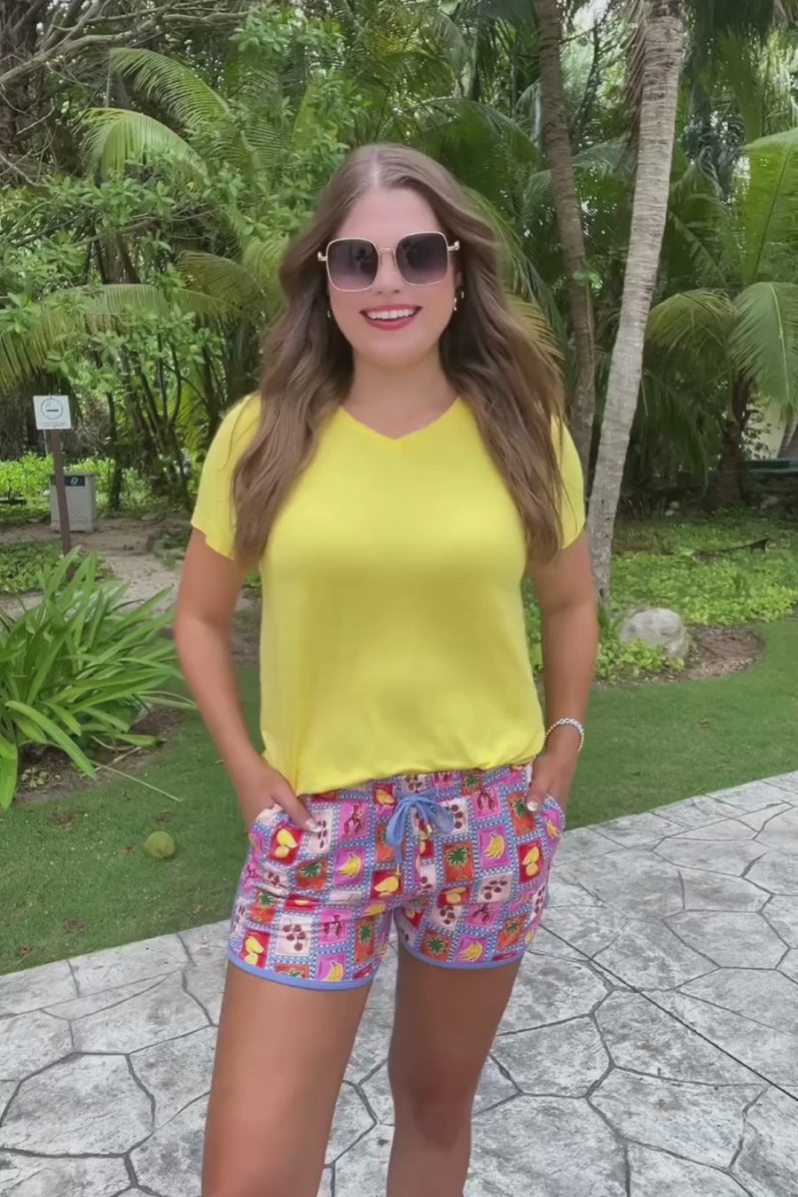 These playful everyday shorts feature a vibrant print of fruit, palm trees, and lobsters—perfect for adding a splash of tropical fun to your casual wardrobe. Lightweight and comfortable, they’ll keep you feeling cool while bringing a vacation vibe wherever you go.