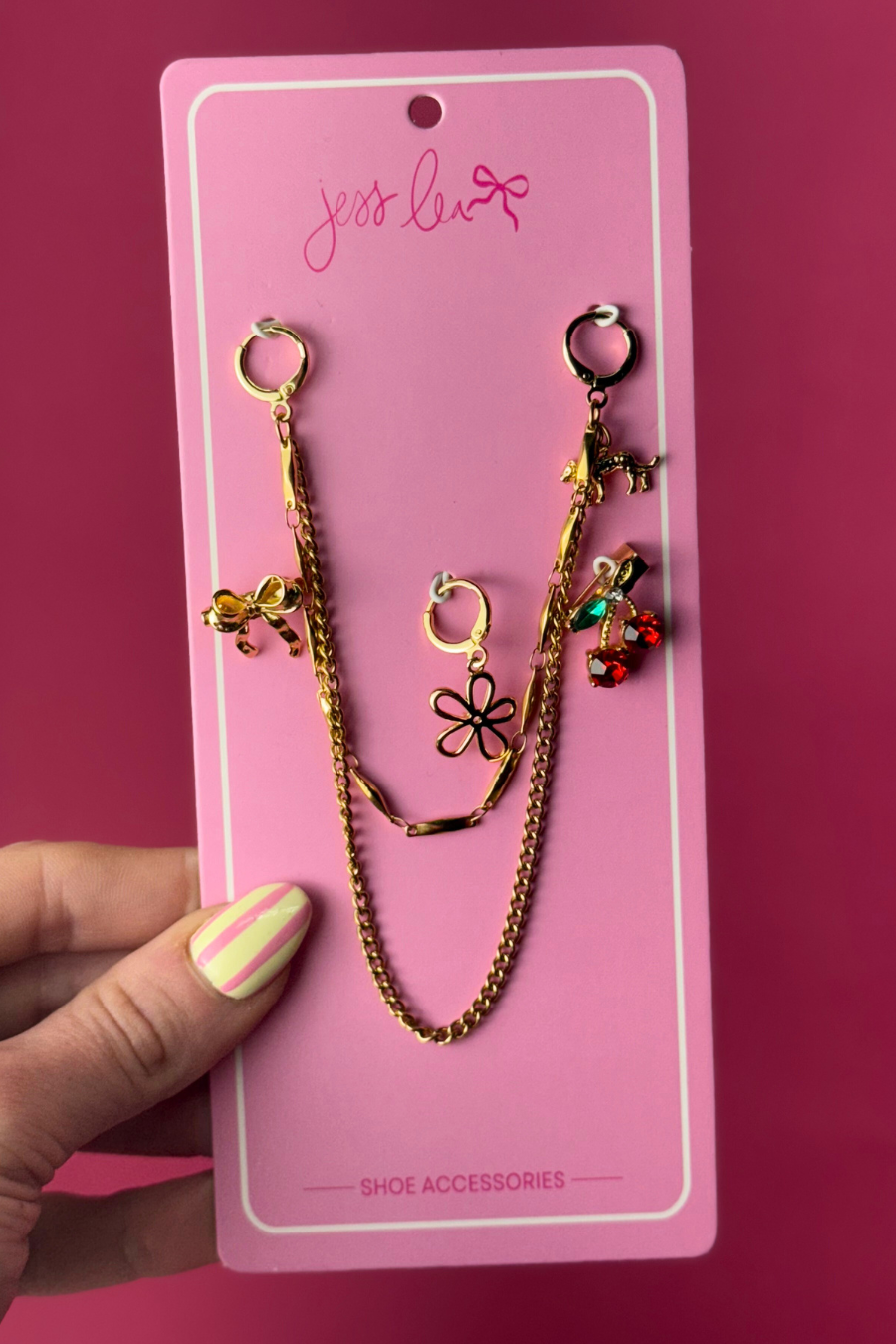Get playful with the Pretty & Prowl shoe charm set, showcasing a cherry, bow, flower, and leopard pins to jazz up your shoes with style.