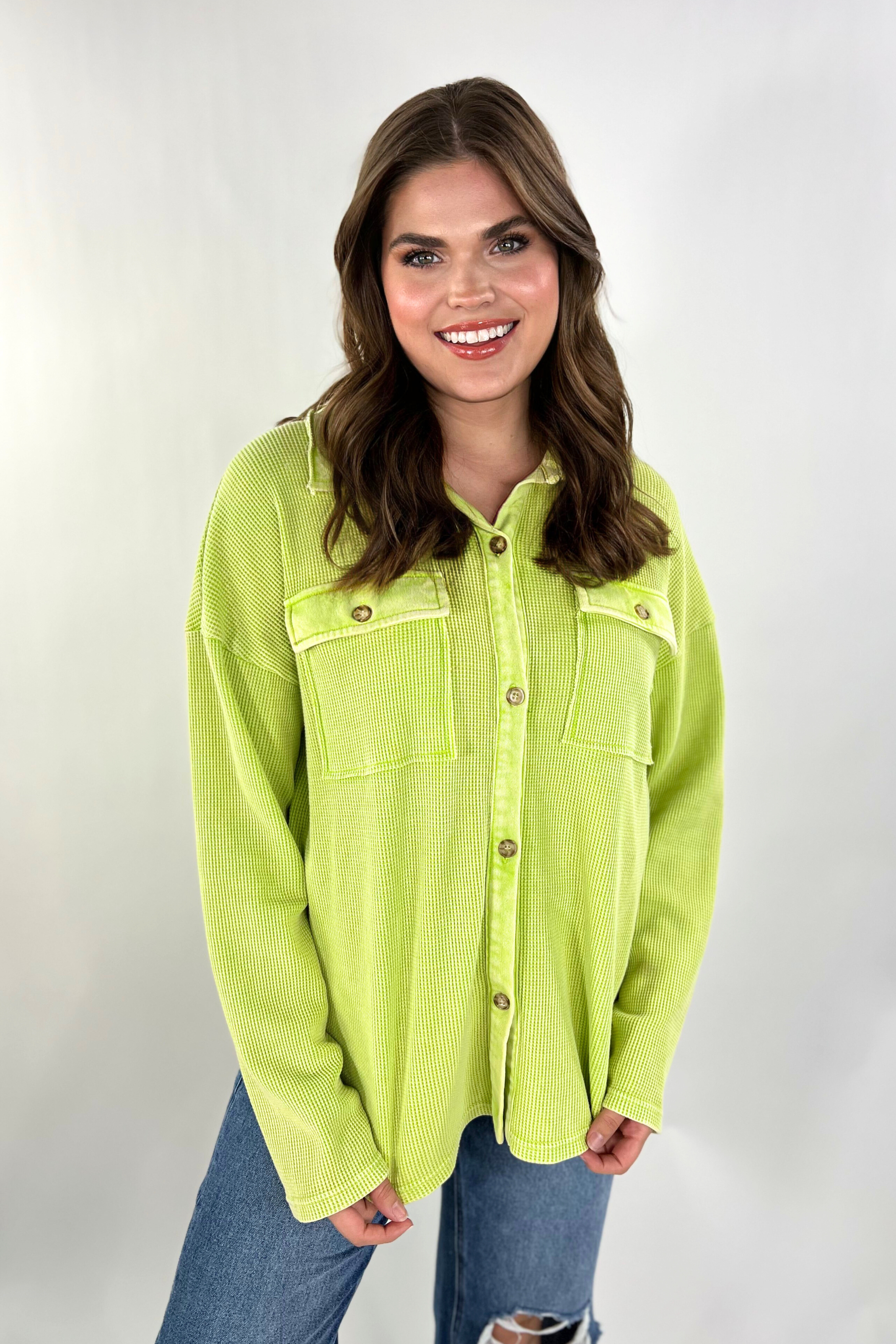 Treat yourself to this casual but cute top featuring soft lightweight material with waffle knit texturing, a button down front, long loose sleeves, two chest pockets, and a relaxed silhouette that falls into a rounded hemline.