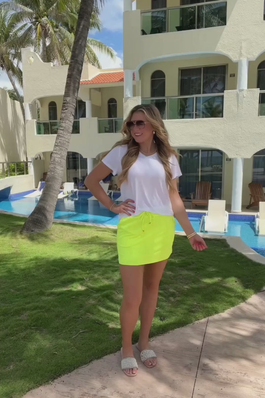 Turn heads with this vibrant neon yellow skort that's equal parts bold and practical. The lightweight, breathable fabric keeps you cool while the stretchy back waistband ensures a comfortable fit all day long. Built-in shorts provide coverage and freedom of movement, while functional side pockets and an adjustable drawstring add everyday convenience. Perfect for making a fun, fearless fashion statement this season!