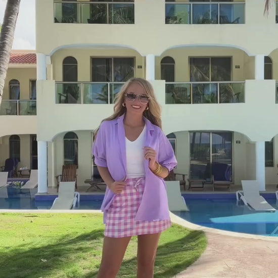 Make a fashion statement with the Sweet Beginnings Gingham Skort. Lightweight and breezy, it includes an elastic back waistband and built-in shorts for all-day comfort. Finished with handy side pockets and a playful drawstring, this skort combines style and practicality effortlessly.